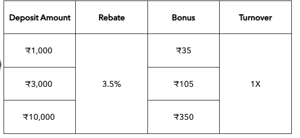 2. Players must have at least ₹1,000 deposit history and fulfill 1X turnover requirement to apply for the withdrawal. The bonus is unlimited!