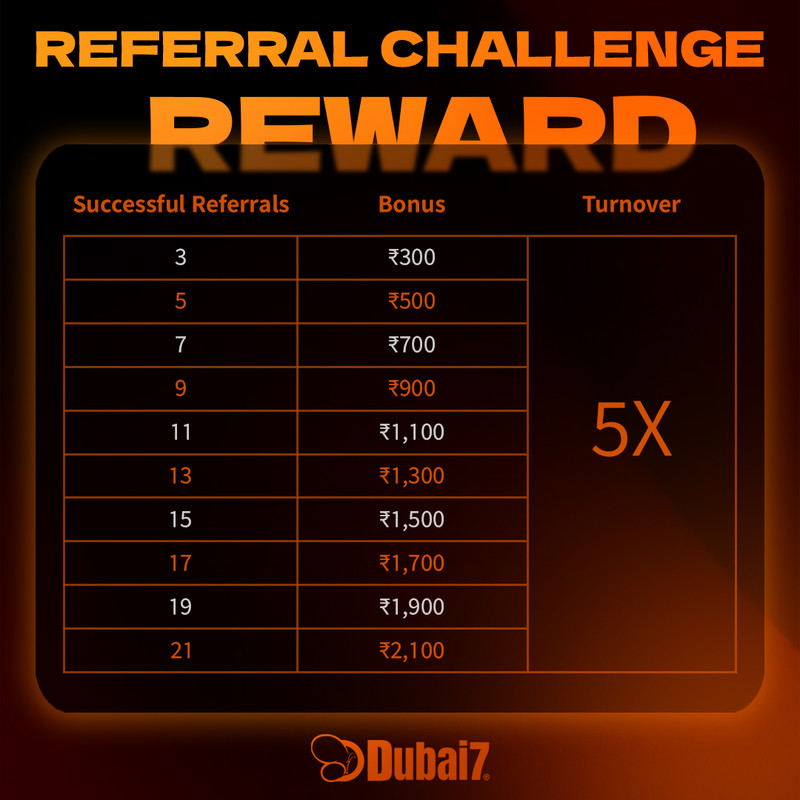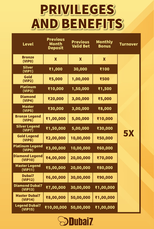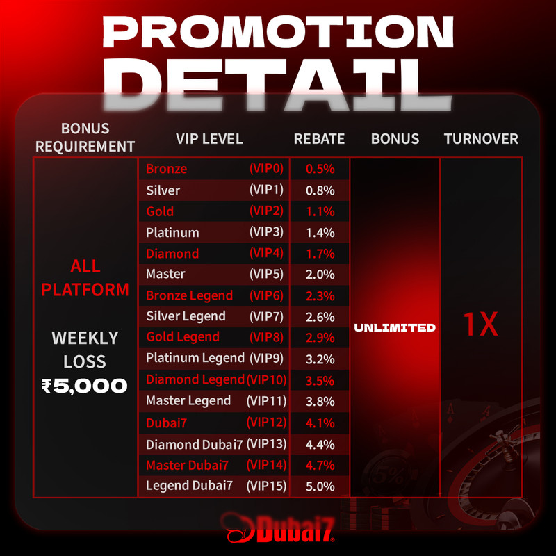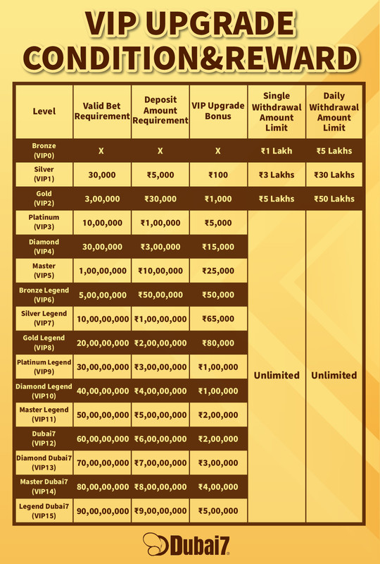 2.【Dubai7 VIP Bonus】will be credited after 23:30 IST once member upgraded.