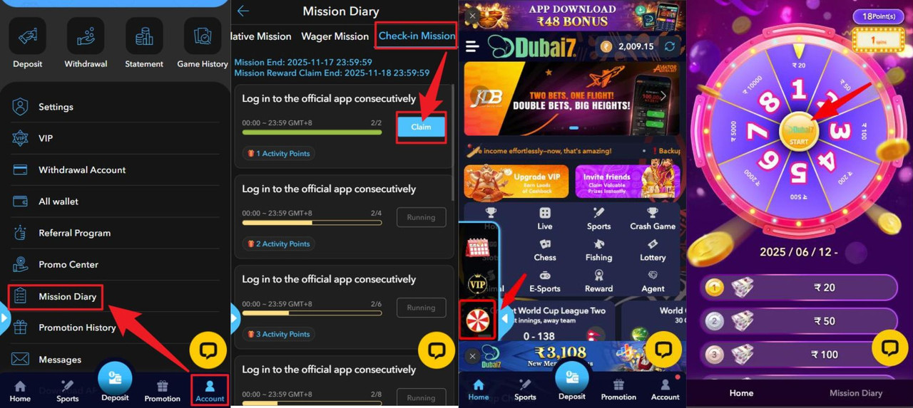 Steps: Click Account > Mission Diary > Check-in Mission > Lucky Spin