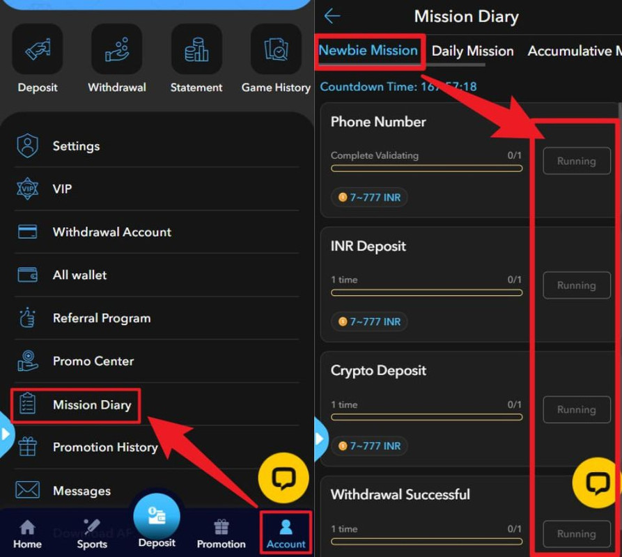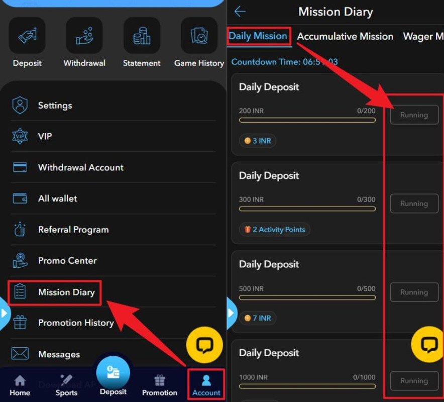 Download APP>Click Account > Mission Diary > Accumulative Mission
