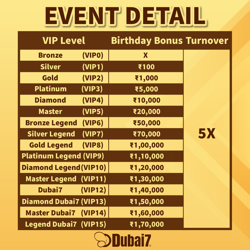 1.【Dubai7 Birthday Bonus】can only be claimed at VIP center once you’ve met the bonus requirement as above chart.