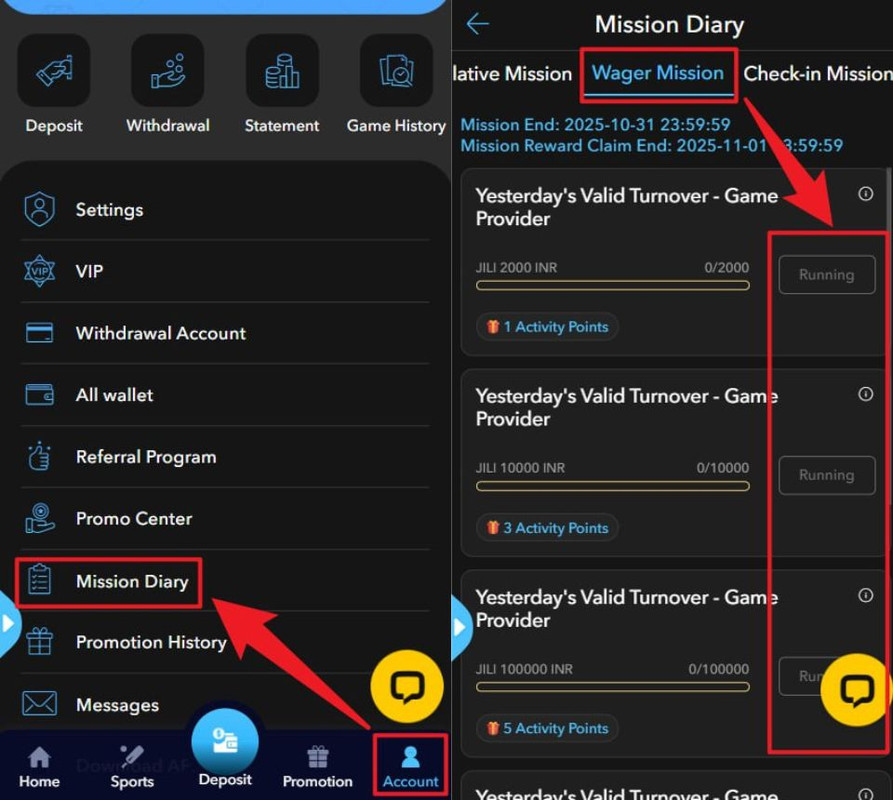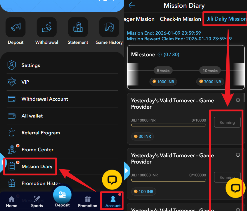 Steps:Click Account > Mission Diary > JILI Daily Mission.
